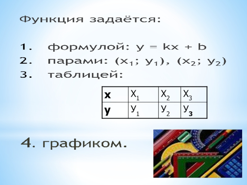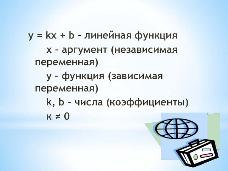 y = kx + b – линейная функция   х – аргумент (независимая переменная)