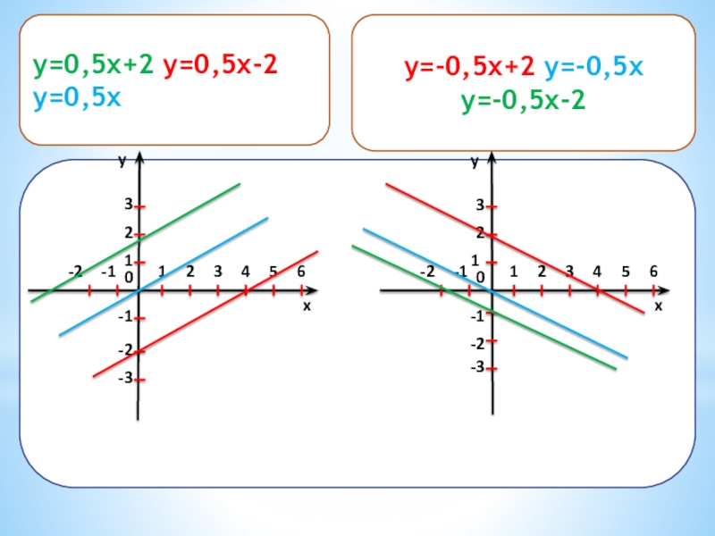 y=-0,5x+2, y=-0,5x, y=-0,5x-2 xy120123-1-2-1-23456-3xy12023-1-2-1-23456-31y=0,5x+2 y=0,5x-2 y=0,5xy=-0,5x+2 y=-0,5x y=-0,5x-2