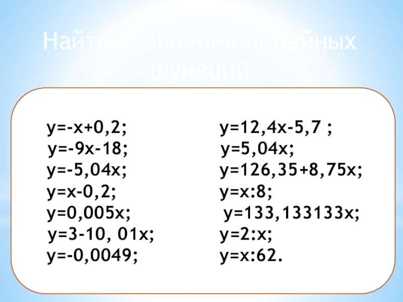 Найти уравнения линейных функций  y=-x+0,2;         y=12,4x-5,7 ;