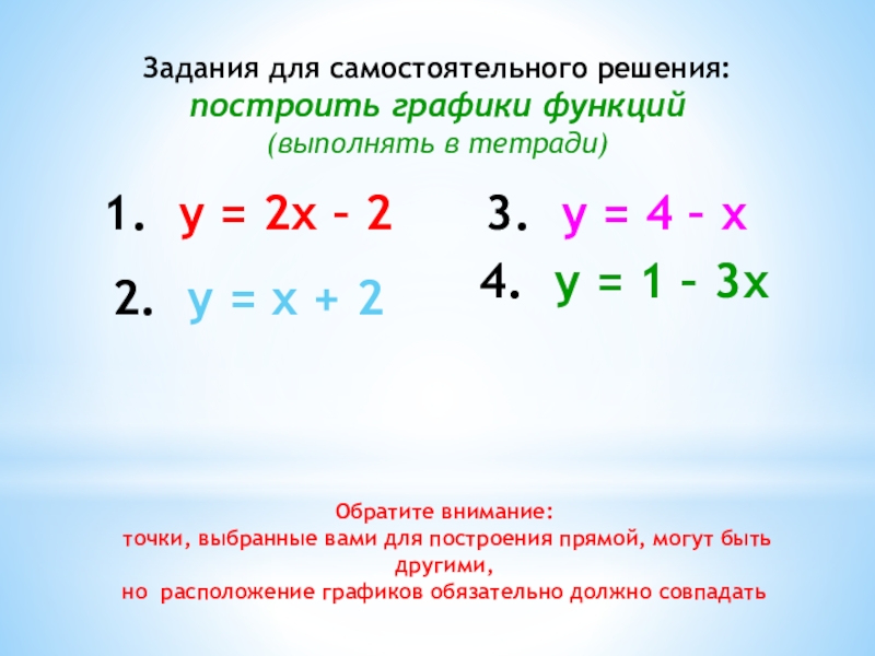 Задания для самостоятельного решения: построить графики функций (выполнять в тетради)1. у = 2х – 22. у =