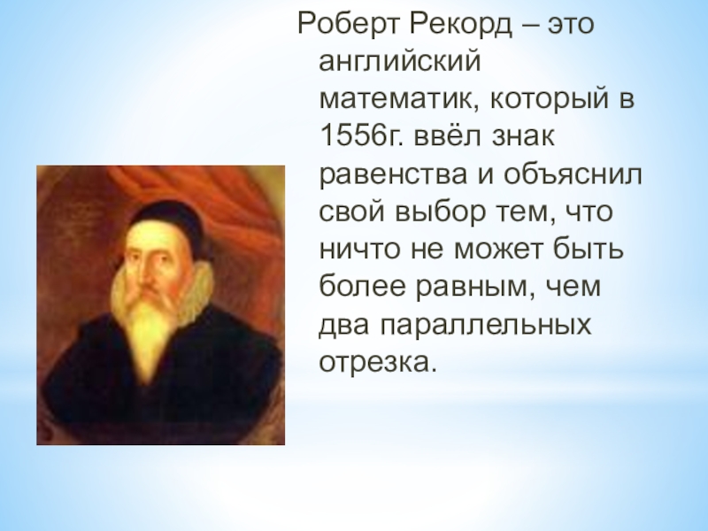 Роберт Рекорд – это английский математик, который в 1556г. ввёл знак равенства и объяснил свой выбор тем,