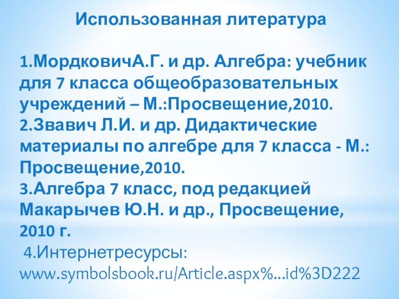 Использованная литература 1.МордковичА.Г. и др. Алгебра: учебник для 7 класса общеобразовательных учреждений – М.:Просвещение,2010.2.Звавич Л.И. и др. Дидактические