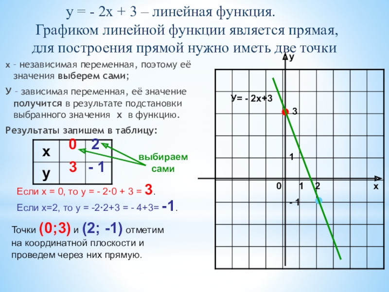Построить график линейной функции у = -2х +3Составим таблицу:ху0311Построим на координатной плоскости точки (0;3) и (1;5) и