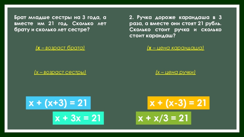 2. Ручка дороже карандаша в 3 раза, а вместе они стоят 21 рубль. Сколько стоит ручка и сколько стоит карандаш?
