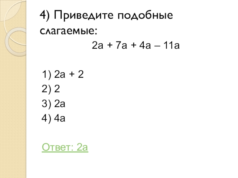 4) Приведите подобные слагаемые:2а + 7а + 4а – 11а1) 2а + 22) 23) 2а4) 4аОтвет: 2а