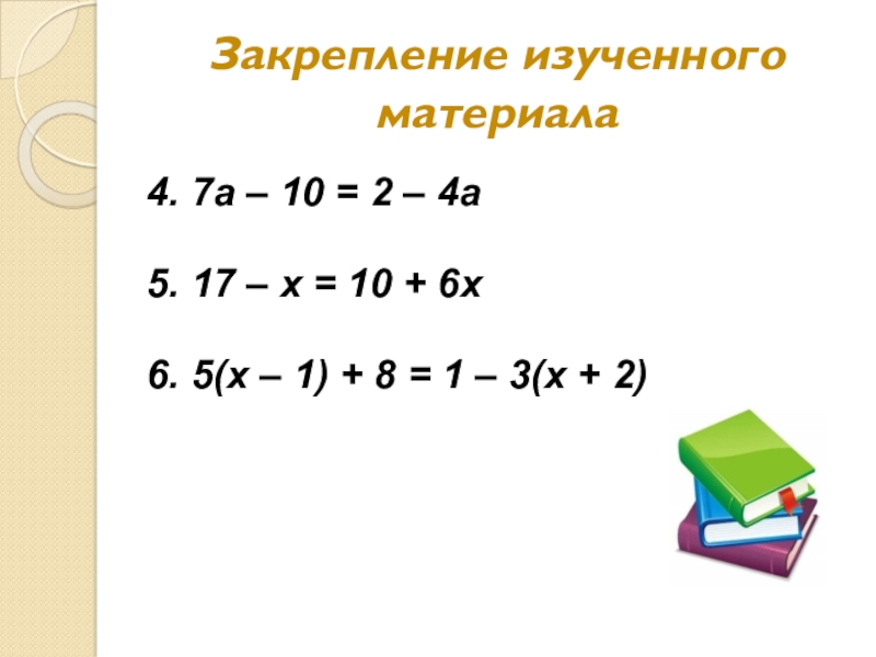 Закрепление изученного материала 4. 7а – 10 = 2 – 4а5. 17 – х = 10 + 6х6.