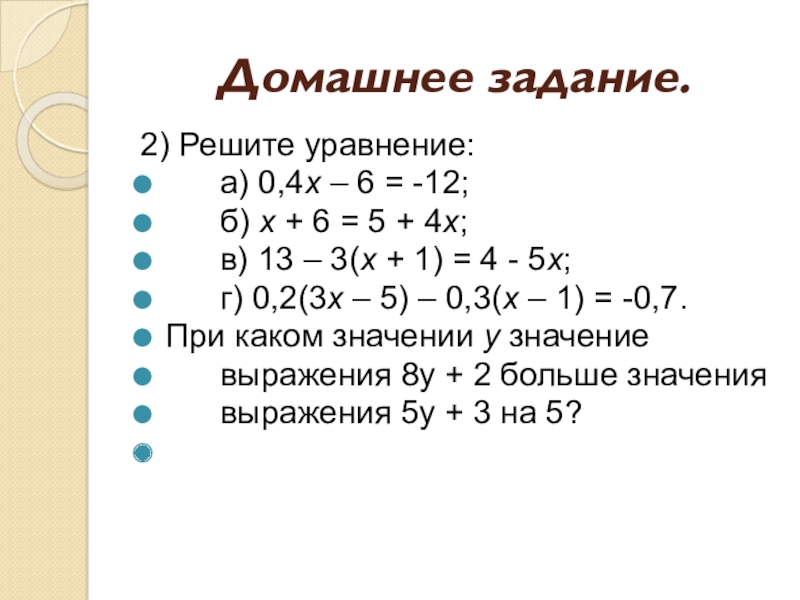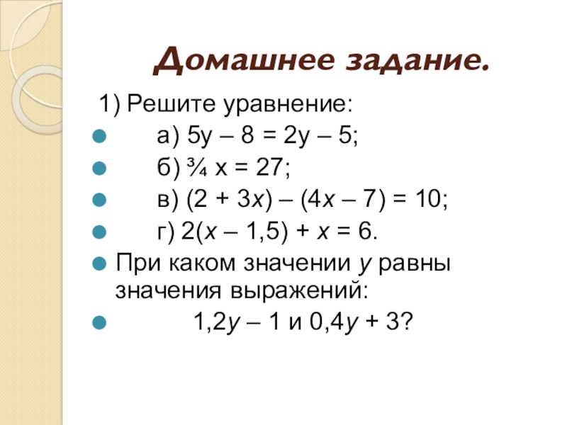 Домашнее задание.    1) Решите уравнение:    а) 5у – 8