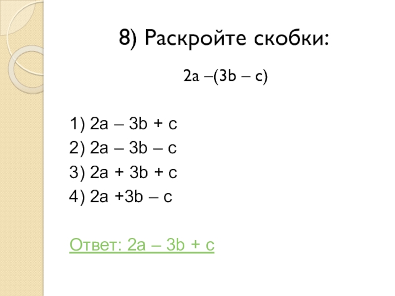 8) Раскройте скобки: 2a –(3b – c)1) 2a – 3b + c2) 2a – 3b – c3)