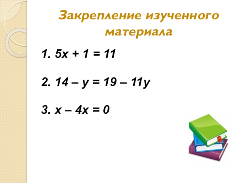 Закрепление изученного материала 1. 5х + 1 = 112. 14 – у = 19 – 11у3. х –