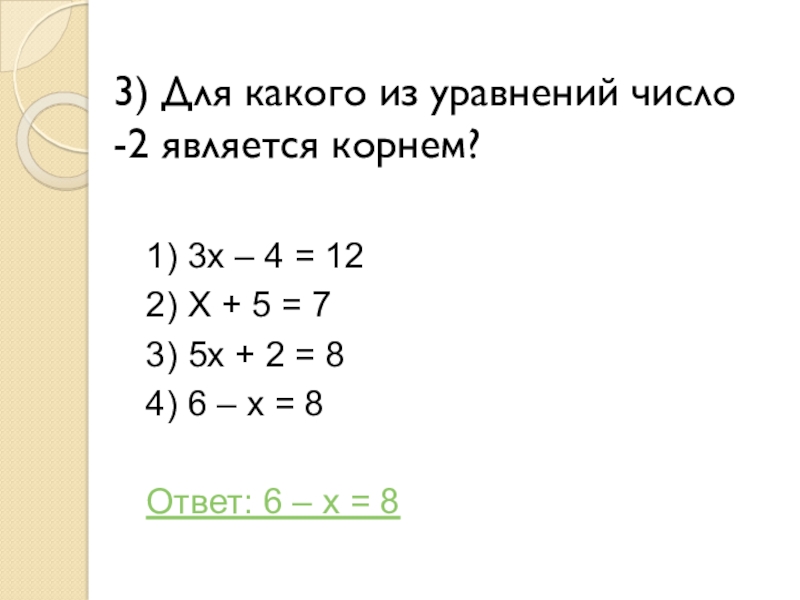 Слайд 4 3) Для какого из уравнений число -2 является корнем?