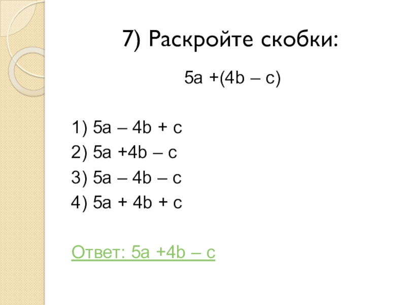7) Раскройте скобки:5a +(4b – c)1) 5a – 4b + c2) 5a +4b – c3) 5a –