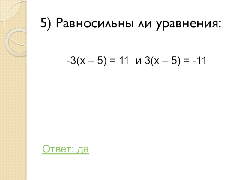 5) Равносильны ли уравнения:-3(х – 5) = 11 и 3(х – 5) = -11Ответ: да