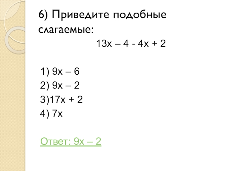 6) Приведите подобные слагаемые:13х – 4 - 4х + 21) 9х – 62) 9х – 23)17х +