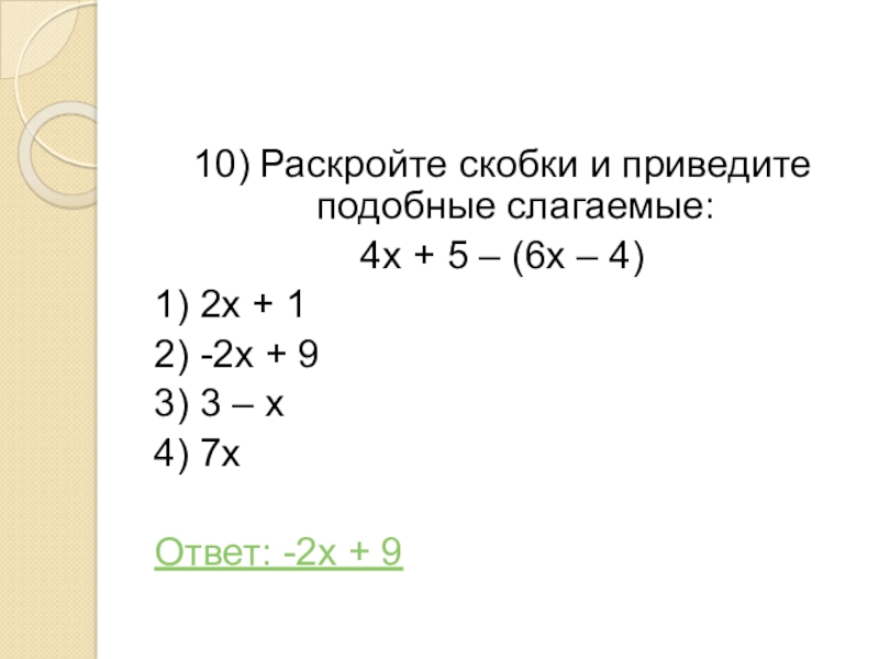 10) Раскройте скобки и приведите подобные слагаемые:4х + 5 – (6х – 4)1) 2х + 12) -2х