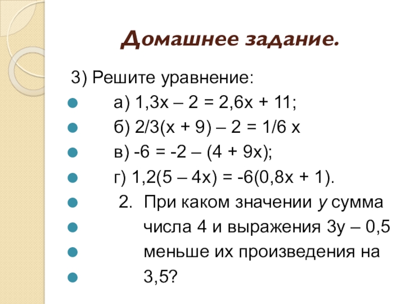 Домашнее задание.3) Решите уравнение:    а) 1,3х – 2 = 2,6х + 11;