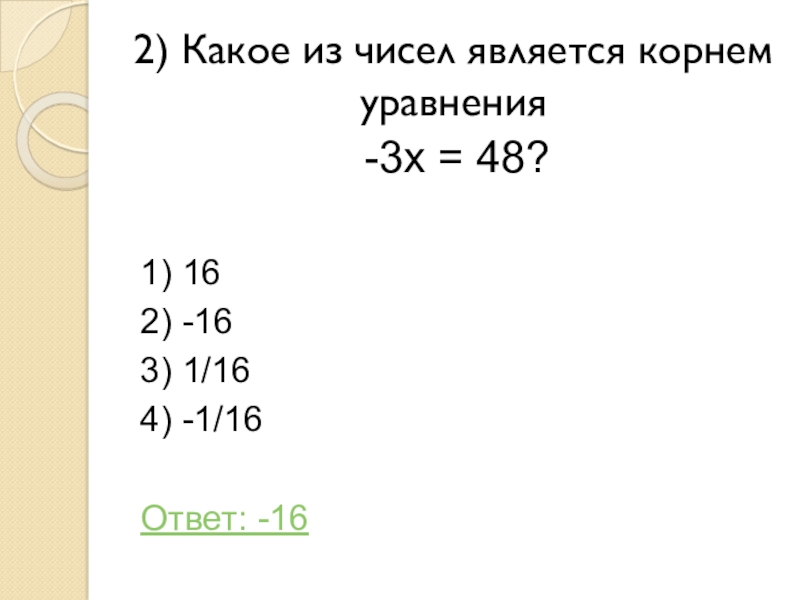 2) Какое из чисел является корнем уравнения  -3х = 48?1) 162) -163) 1/164) -1/16Ответ: -16