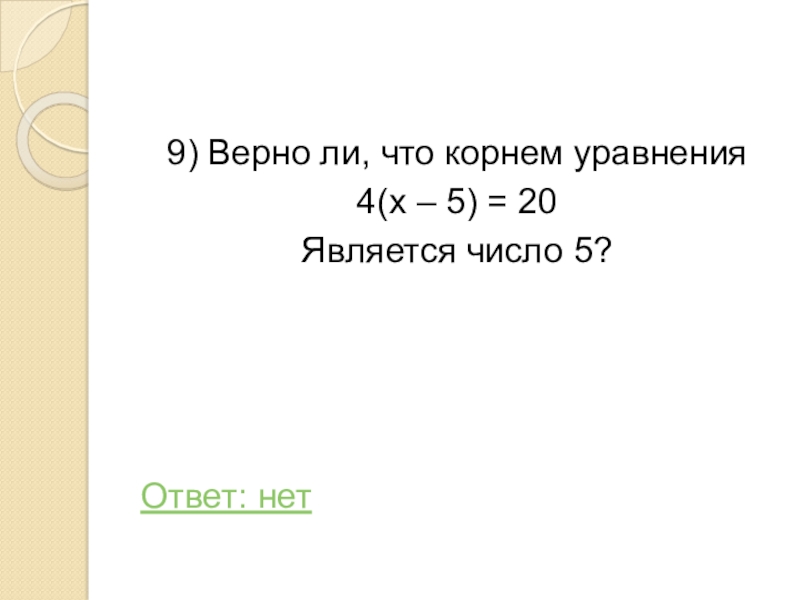 9) Верно ли, что корнем уравнения4(х – 5) = 20Является число 5?Ответ: нет