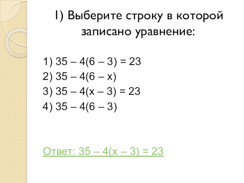 1) Выберите строку в которой записано уравнение:1) 35 – 4(6 – 3) = 232) 35 – 4(6