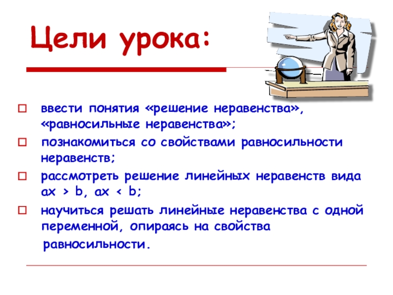 научиться решать линейные неравенства с одной переменной, опираясь на свойства