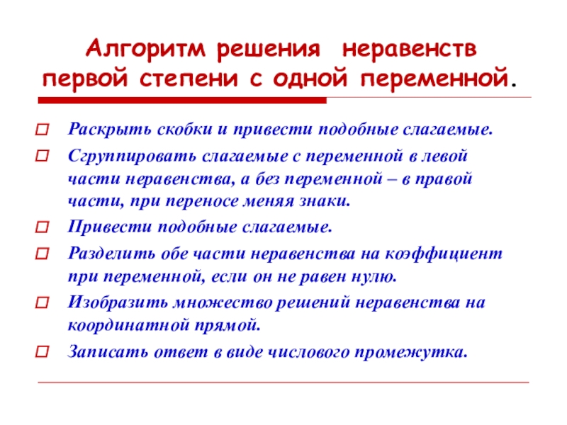 рассмотреть решение линейных неравенств вида ах > b, ax < b;