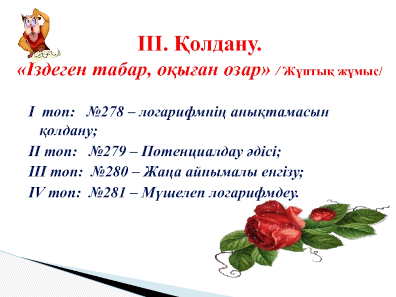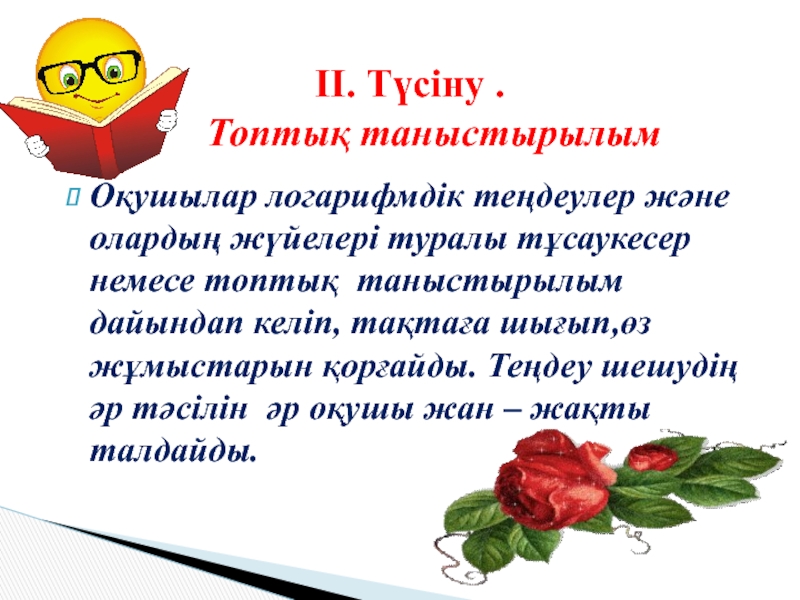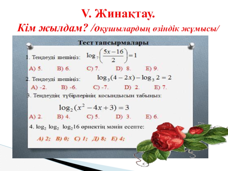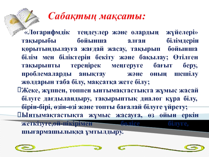 Логарифмдік теңдеулер және олардың жүйелері. /есептер шығару/