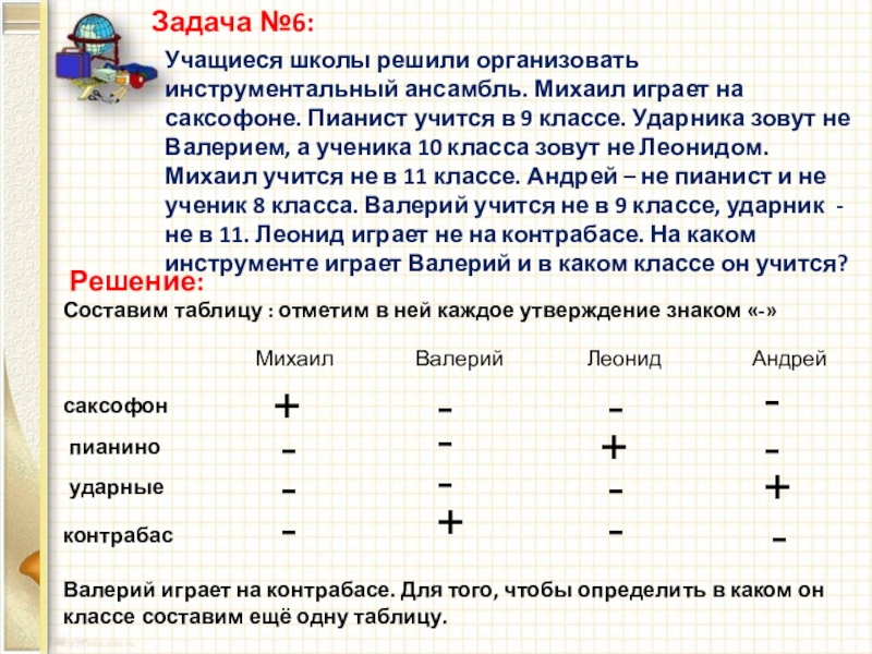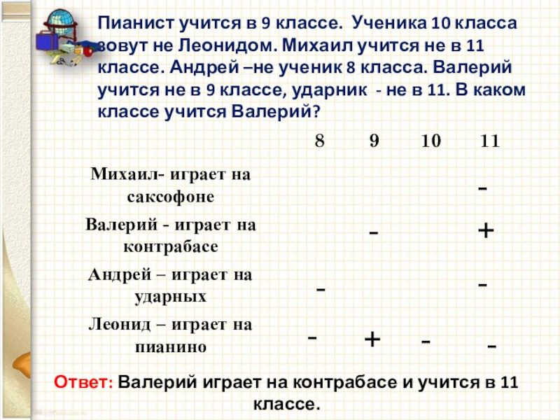 Ответ: Валерий играет на контрабасе и учится в 11 классе.
