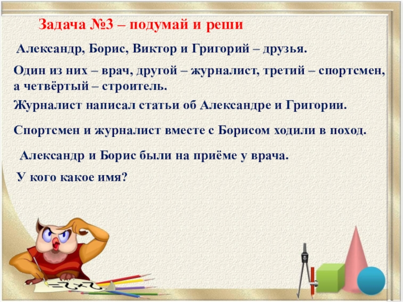 Ответ: Александр - спортсмен, Борис - строитель, Виктор – журналист, Григорий – врач.