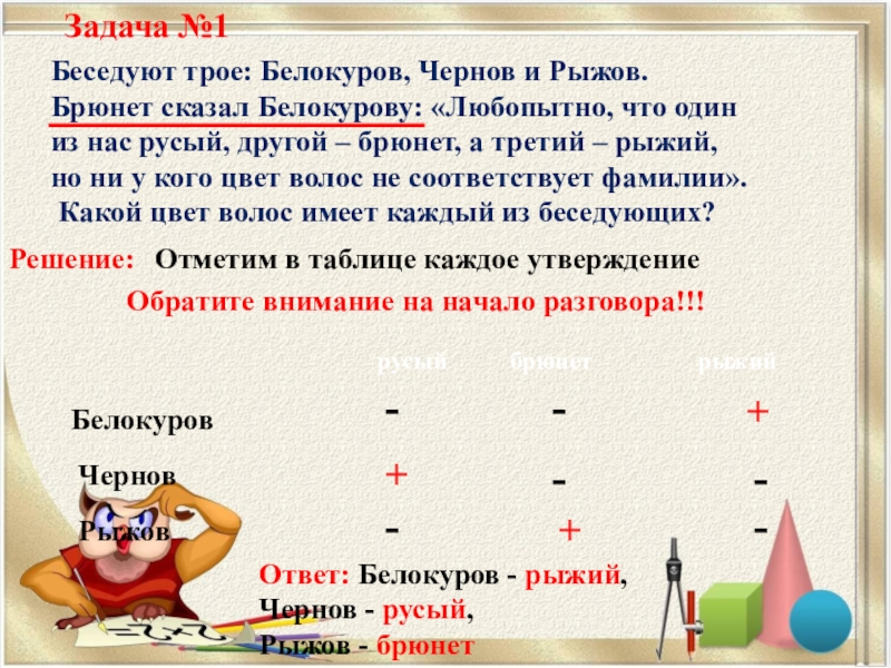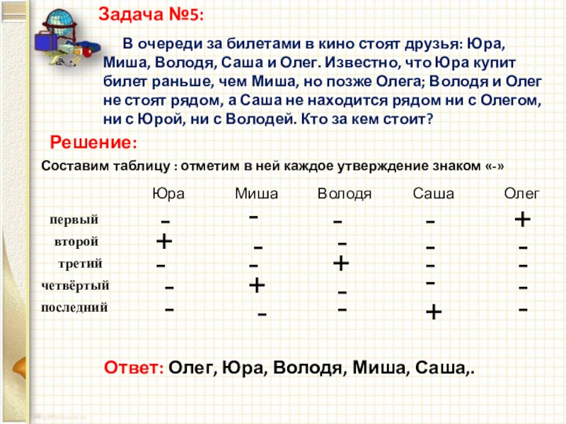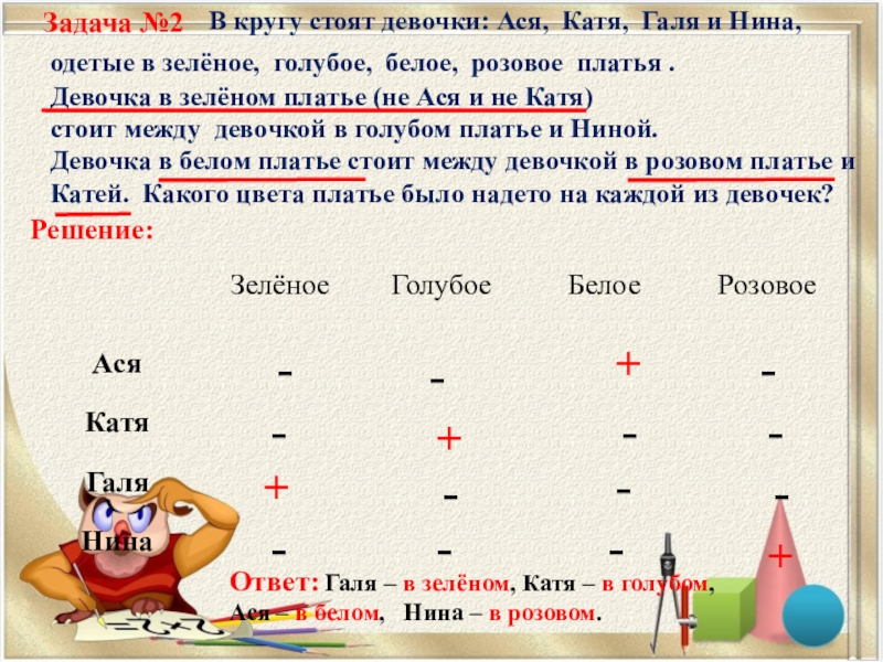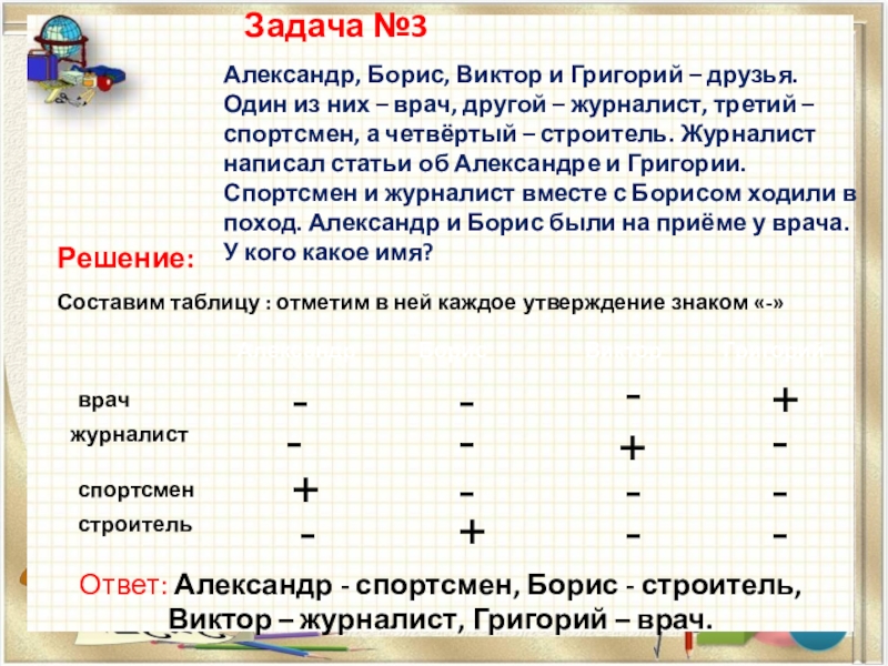 Составим таблицу : отметим в ней каждое утверждение знаком «-»