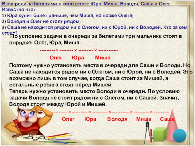 Поэтому нужно установить места в очереди для Саши и Володи. Но Саша не находится рядом ни с Олегом, ни с Юрой, ни с Володей. Это возможно лишь в том случае, когда Саша стоит за Мишей, а остальные ребята стоят перед Мишей. Теперь нужно установить место Володи в очереди. По условию задачи Володя не стоит рядом ни с Олегом, ни с Сашей. Значит, Володя стоит между Юрой и Мишей.