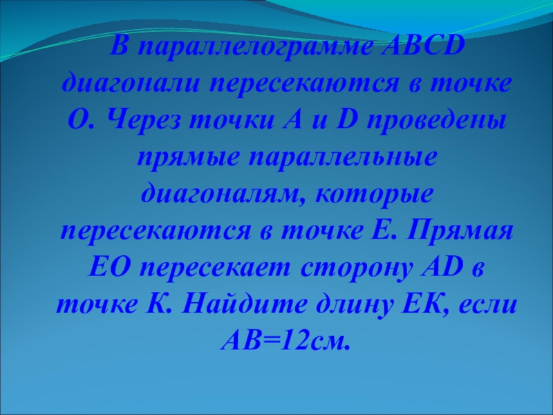 и D проведены прямые параллельные диагоналям, которые пересекаются в точке Е. Прямая ЕО пересекает сторону AD в точке К. Найдите длину ЕК, если АВ=12см.