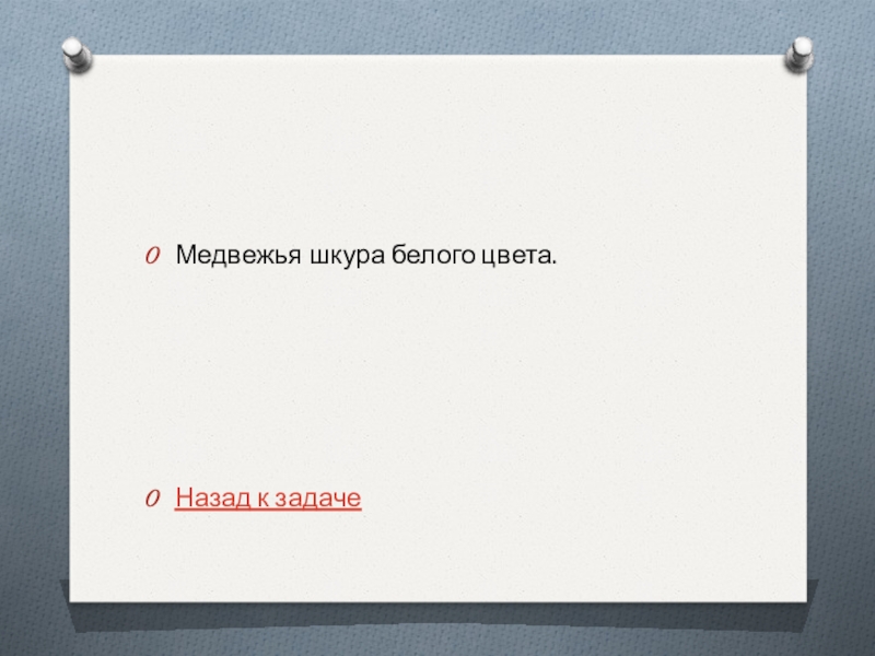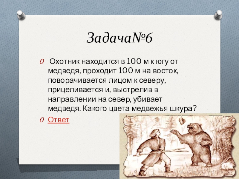 100 м на восток, поворачивается лицом к северу, прицеливается и, выстрелив в направлении на север, убивает медведя. Какого цвета медвежья шкура?