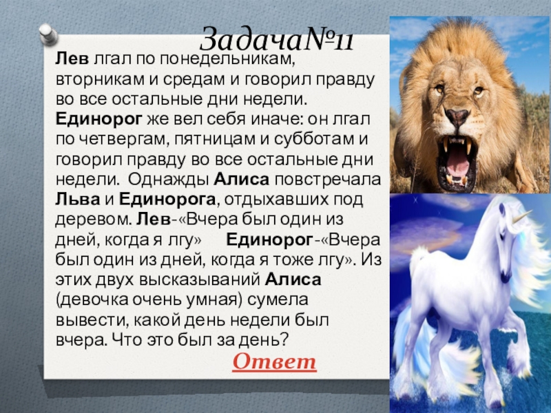 все остальные дни недели. Единорог же вел себя иначе: он лгал по четвергам, пятницам и субботам и говорил правду во все остальные дни недели. Однажды Алиса повстречала Льва и Единорога, отдыхавших под деревом. Лев-«Вчера был один из дней, когда я лгу» Единорог-«Вчера был один из дней, когда я тоже лгу». Из этих двух высказываний Алиса (девочка очень умная) сумела вывести, какой день недели был вчера. Что это был за день?