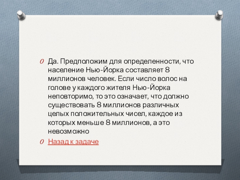 Если число волос на голове у каждого жителя Нью-Йорка неповторимо, то это означает, что должно существовать 8 миллионов различных целых положительных чисел, каждое из которых меньше 8 миллионов, а это невозможно
