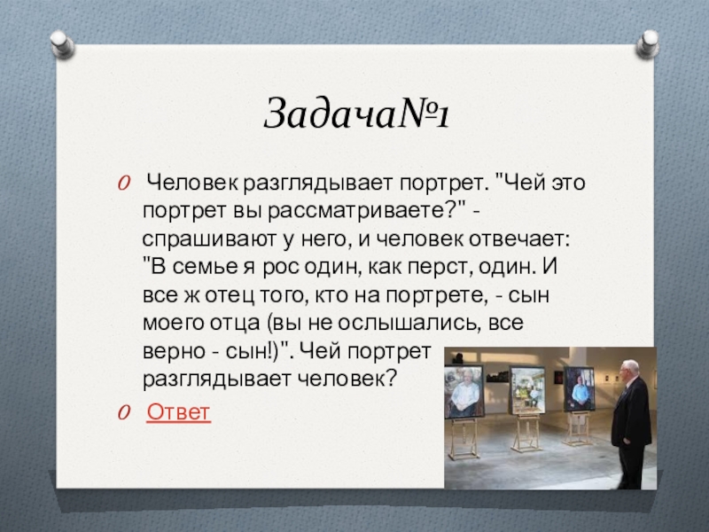 Поскольку я отец человека на портрете, то он должен быть моим сыном. Следовательно, правильный ответ состоит в том, что человек разглядывает портрет своего сына.