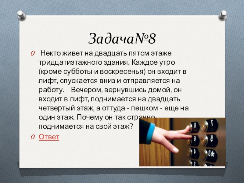 (кроме субботы и воскресенья) он входит в лифт, спускается вниз и отправляется на работу. Вечером, вернувшись домой, он входит в лифт, поднимается на двадцать четвертый этаж, а оттуда - пешком - еще на один этаж. Почему он так странно поднимается на свой этаж?