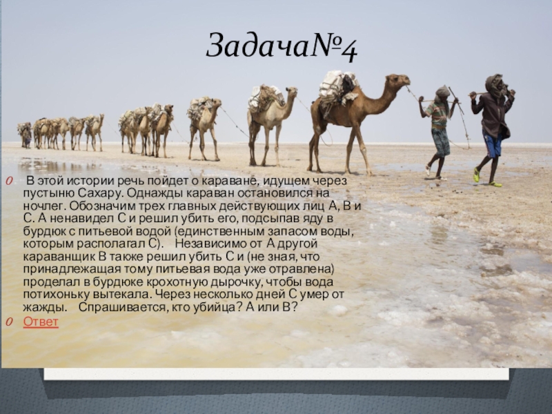 Сахару. Однажды караван остановился на ночлег. Обозначим трех главных действующих лиц A, B и C. A ненавидел C и решил убить его, подсыпав яду в бурдюк с питьевой водой (единственным запасом воды, которым располагал C). Независимо от A другой караванщик B также решил убить C и (не зная, что принадлежащая тому питьевая вода уже отравлена) проделал в бурдюке крохотную дырочку, чтобы вода потихоньку вытекала. Через несколько дней C умер от жажды. Спрашивается, кто убийца? A или B?