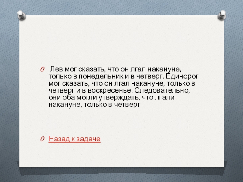 Слайд 13Лев лгал по понедельникам, вторникам и средам и говорил правду во