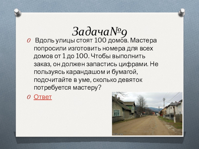 всех домов от 1 до 100. Чтобы выполнить заказ, он должен запастись цифрами. Не пользуясь карандашом и бумагой, подсчитайте в уме, сколько девяток потребуется мастеру?