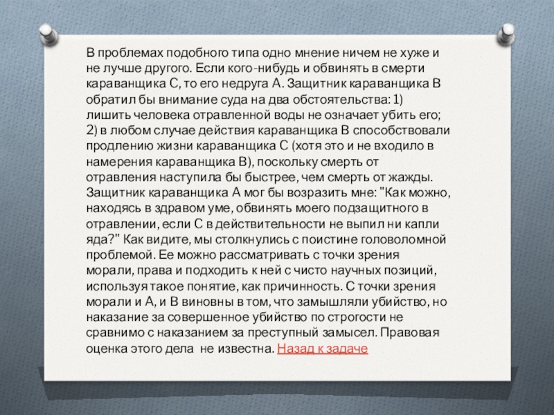 лучше другого. Если кого-нибудь и обвинять в смерти караванщика C, то его недруга A. Защитник караванщика B обратил бы внимание суда на два обстоятельства: 1) лишить человека отравленной воды не означает убить его; 2) в любом случае действия караванщика B способствовали продлению жизни караванщика C (хотя это и не входило в намерения караванщика B), поскольку смерть от отравления наступила бы быстрее, чем смерть от жажды. Защитник караванщика A мог бы возразить мне: "Как можно, находясь в здравом уме, обвинять моего подзащитного в отравлении, если C в действительности не выпил ни капли яда?" Как видите, мы столкнулись с поистине головоломной проблемой. Ее можно рассматривать с точки зрения морали, права и подходить к ней с чисто научных позиций, используя такое понятие, как причинность. С точки зрения морали и A, и B виновны в том, что замышляли убийство, но наказание за совершенное убийство по строгости не сравнимо с наказанием за преступный замысел. Правовая оценка этого дела не известна. Назад к задаче