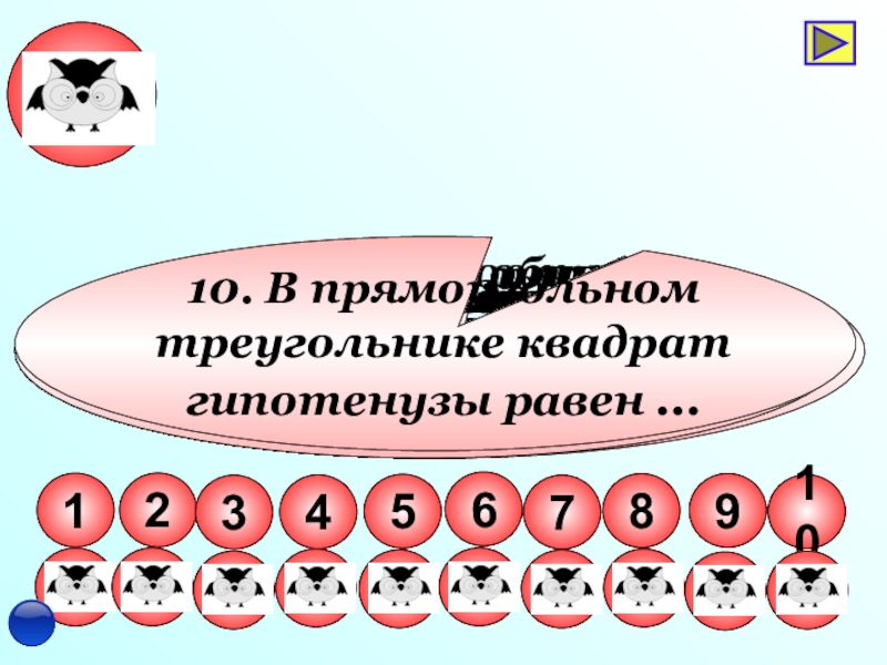 10. В прямоугольном треугольнике квадрат гипотенузы равен …