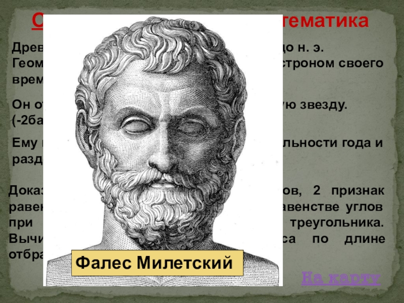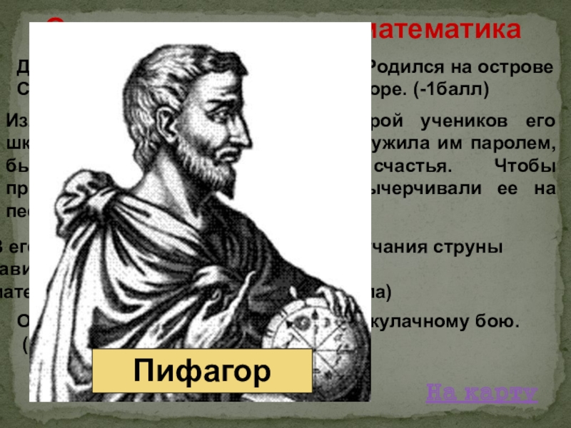 В его школе установили, что высота звучания струны зависит от ее длины, и создали первую математическую теорию музыки.(-3балла)