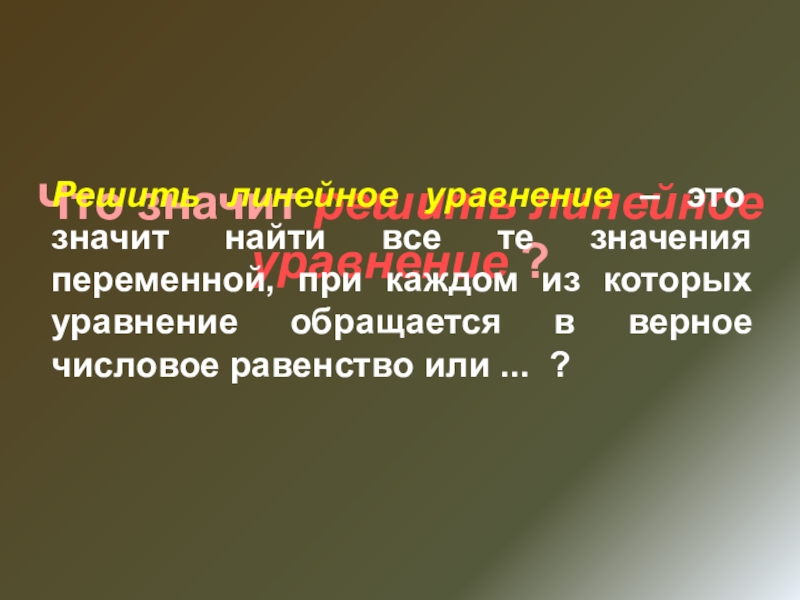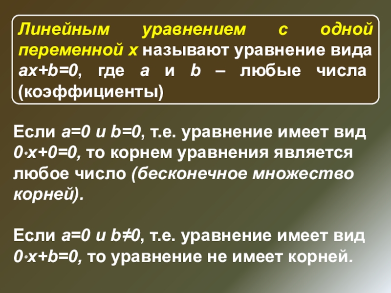 Если а=0 и b=0, т.е. уравнение имеет вид 0⋅x+0=0, то корнем уравнения является любое число (бесконечное множество корней).
