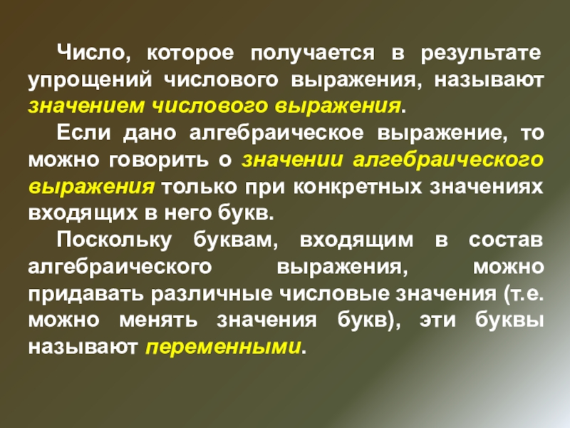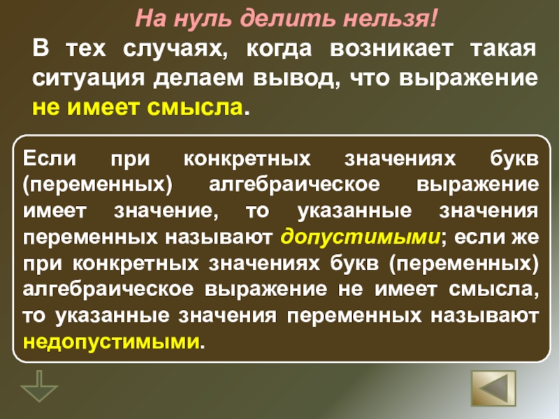 Если при конкретных значениях букв (переменных) алгебраическое выражение имеет значение, то указанные значения переменных называют допустимыми; если же при конкретных значениях букв (переменных) алгебраическое выражение не имеет смысла, то указанные значения переменных называют недопустимыми.