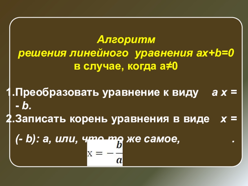Если а=0 и b≠0, т.е. уравнение имеет вид 0⋅x+b=0, то уравнение не имеет корней.