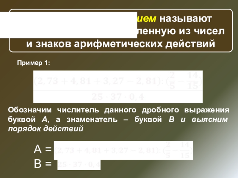 Обозначим числитель данного дробного выражения буквой А, а знаменатель – буквой В и выясним порядок действий