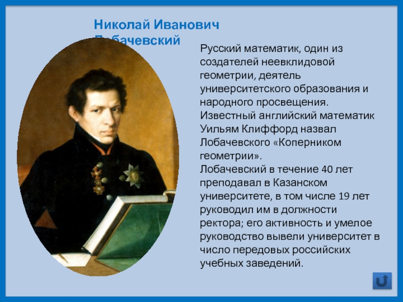Русский математик, один из создателей неевклидовой геометрии, деятель университетского