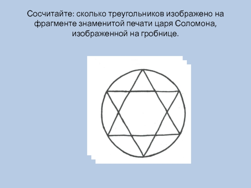 Слайд 20Сосчитайте: сколько треугольников изображено на фрагменте знаменитой печати царя Соломона, изображенной