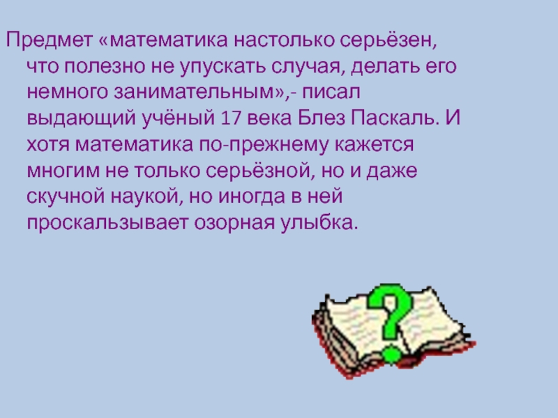 немного занимательным»,- писал выдающий учёный 17 века Блез Паскаль. И хотя математика по-прежнему кажется многим не только серьёзной, но и даже скучной наукой, но иногда в ней проскальзывает озорная улыбка.