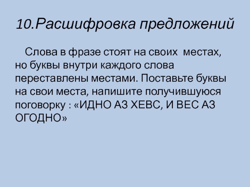 каждого слова переставлены местами. Поставьте буквы на свои места, напишите получившуюся поговорку : «ИДНО АЗ ХЕВС, И ВЕС АЗ ОГОДНО»