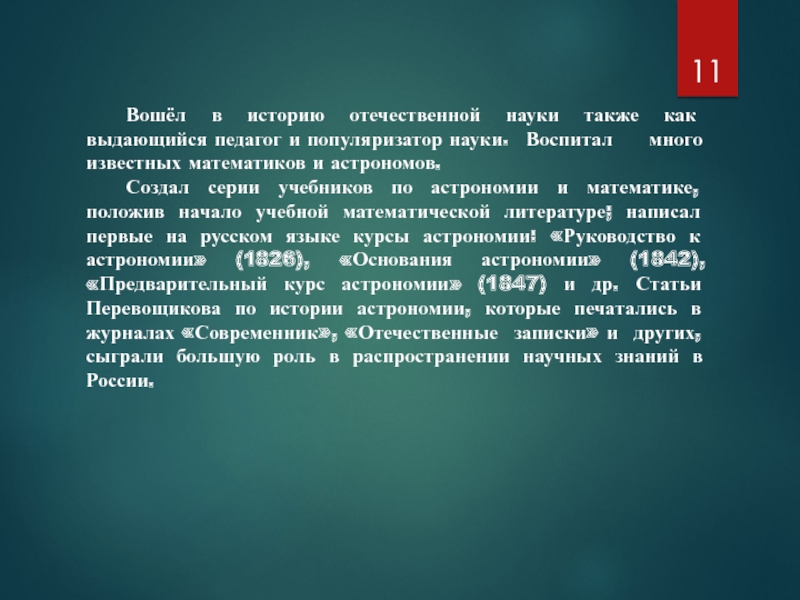 Слайд 11 Вошёл в историю отечественной науки также как выдающийся педагог и популяризатор